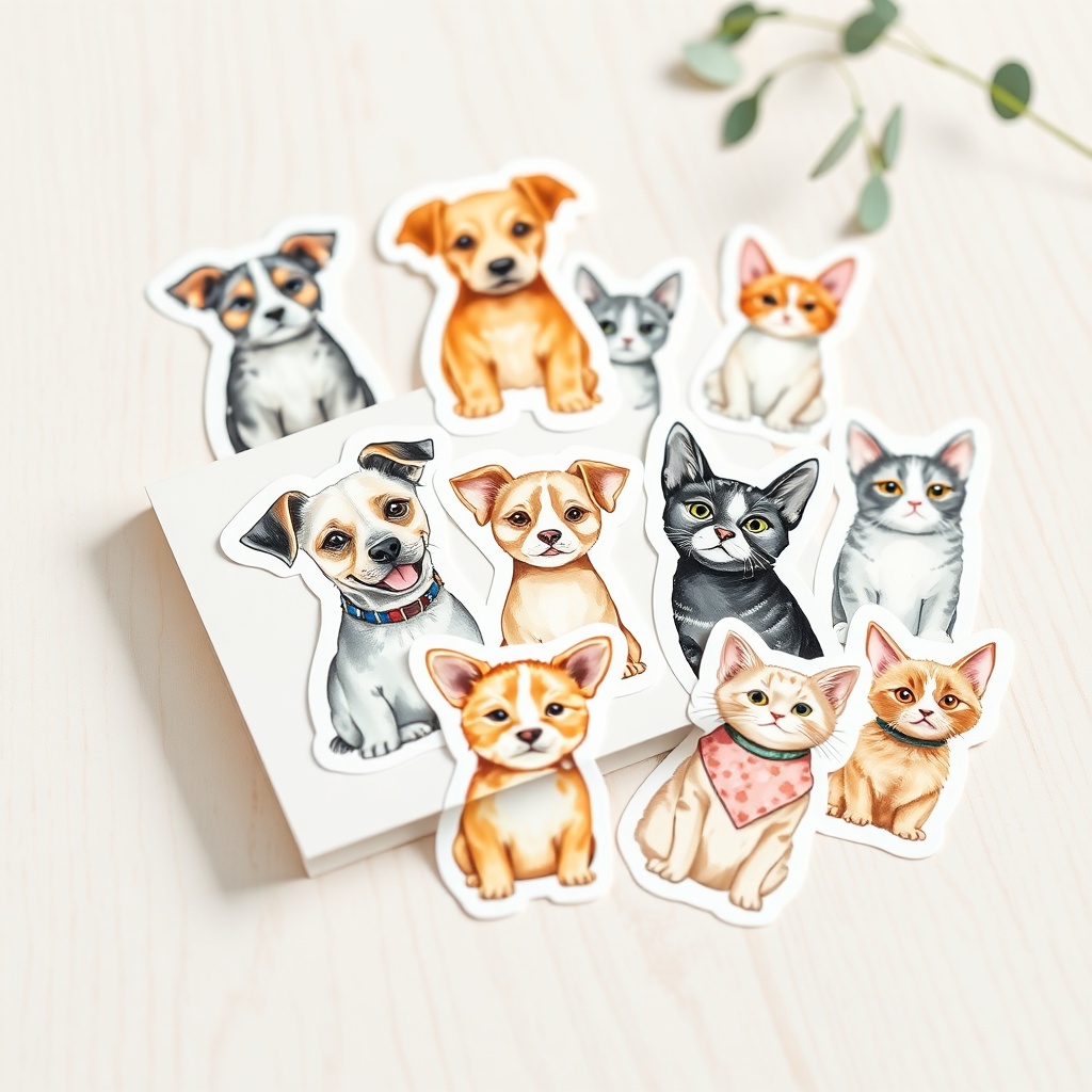 Pack de pegatinas personalizadas con el retrato artístico de tu mascota. Impermeables y duraderas.